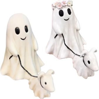 The statue features an adorable dog dressed as a ghost. designed to blend cuteness with a touch of spookiness. is a lovable addition to any Halloween themed decor. delighting both kids and adults.